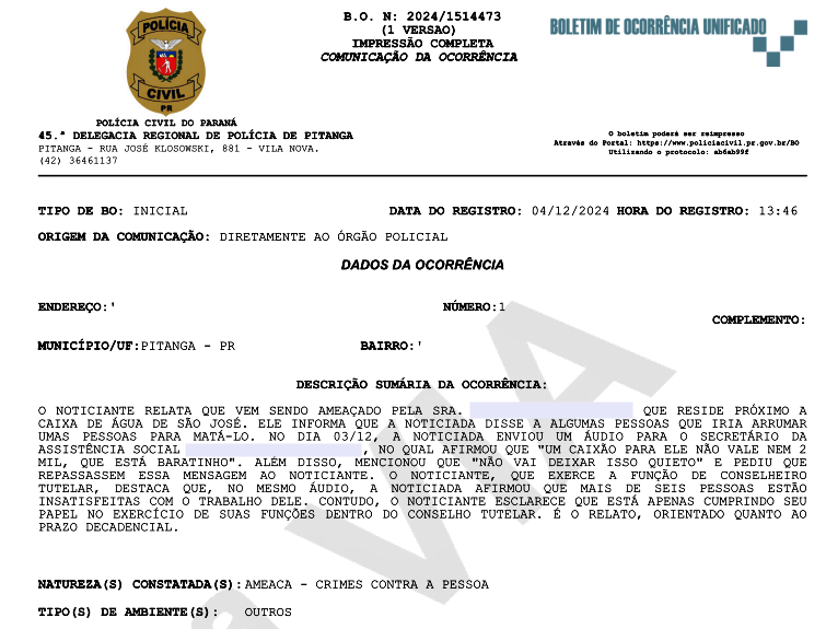 Segundo o Conselheiro Tutelar, que registrou um Boletim de Ocorrência junto a Polícia Civil de Pitanga, vem sendo ameaçado por uma mulher que se intitula “benzedeira”, moradora do Distrito de São José, no interior do Município de Santa Maria do Oeste, nas proximidades da Caixa de Água.
