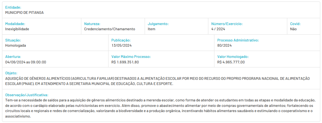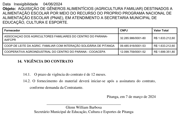 A Associação dos Agricultores Familiares do Centro do Paraná – AAFCPR, CNPJ nº 32.285.986/0001-80, que consta a sua localização, na Rua Conselheiro Zacarias, 644, no Centro da cidade de Pitanga/PR, e que tem como representante, o Sr. José Airso Zerbinatti, que mora no Sitio Ouro Verde, no interior do Município de Borrazópolis/PR, que foram recentemente contratados tanto juridicamente como pessoa física, pela Prefeitura de Santa Maria do Oeste com um valor total de R$ 196.860,19 para o fornecimento da merenda escolar naquele município, a tempo esta mesma Cooperativa vem fornecendo merenda escolar para o Município de Pitanga e, o último contrato, venceu agora em 07 de março de 2025, com um valor de R$ 1.633.212,60.