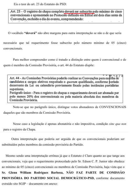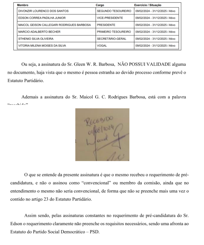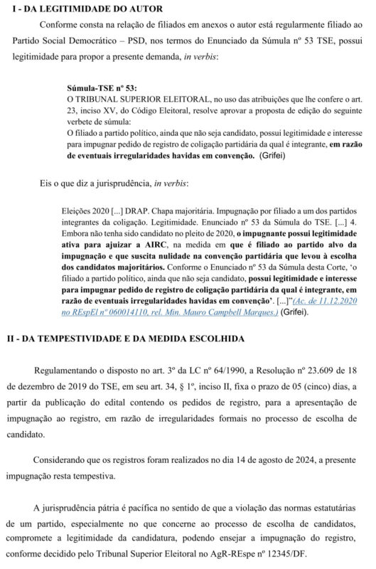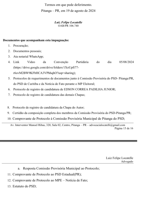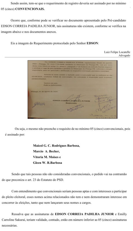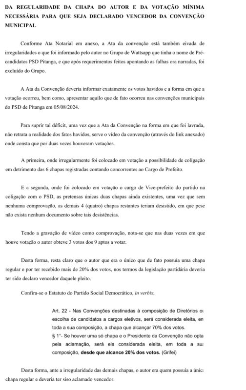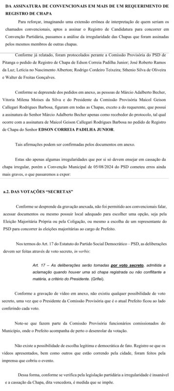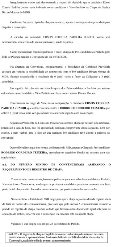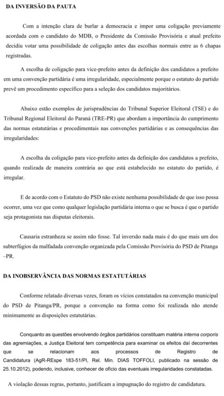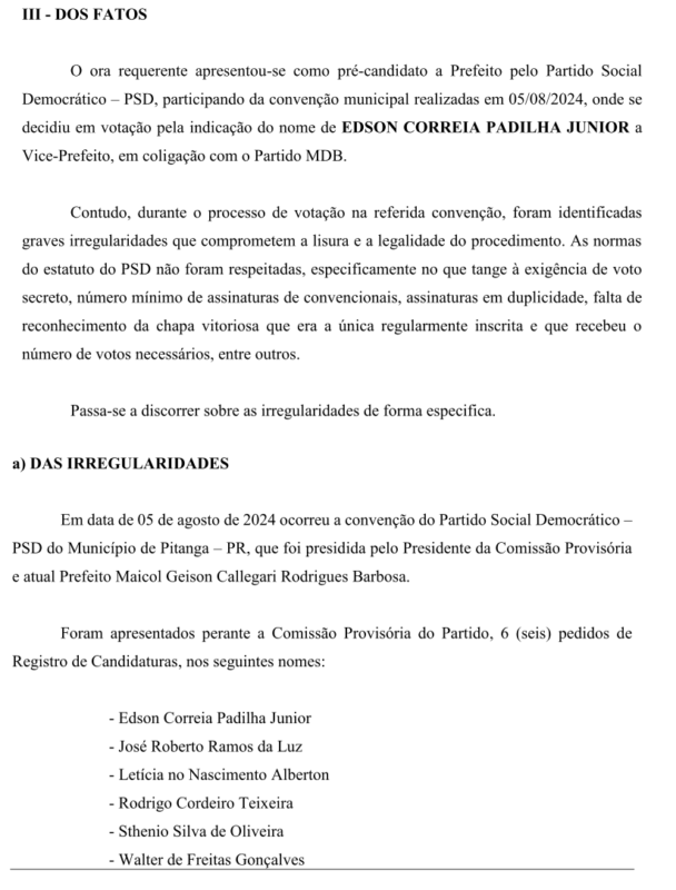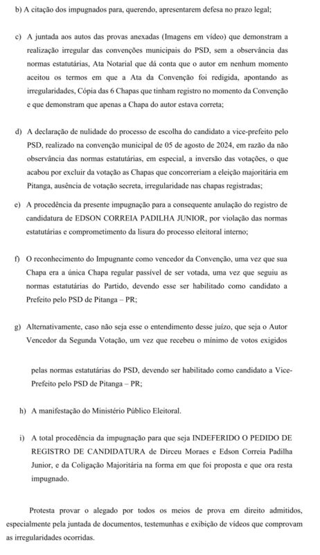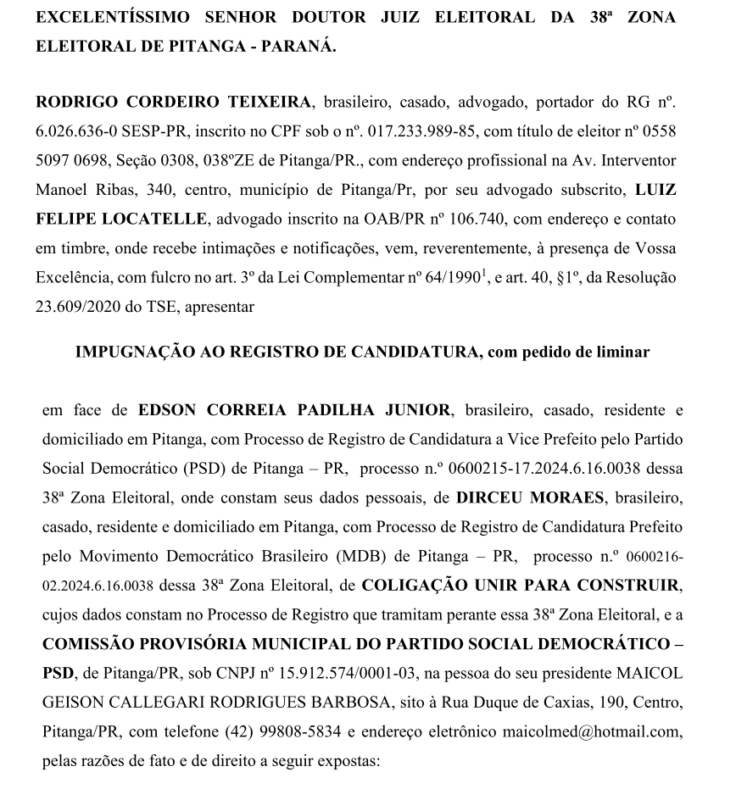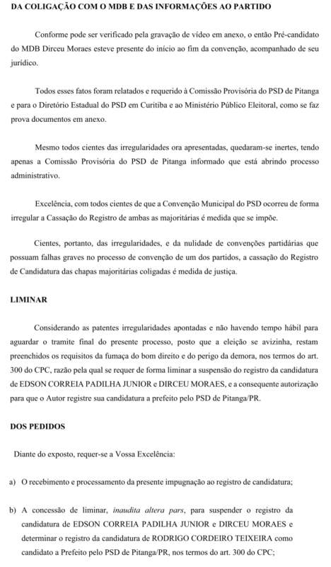 Um documento (pedido de impugnação de registro de candidatura) protocolado pelo vereador e advogado Rodrigo Cordeiro Teixeira, no Ministério Público Eleitoral da Comarca de Pitanga com data de segunda-feira, dia 19 de agosto de 2024, pede a cassação da Chapa encabeçada pelo Candidato a Prefeito Sargento Moraes (MDB) e o candidato a vice Juninho Padilha (PSD), por motivo de várias irregularidades apontadas que foram cometidas na convenção do PSD.