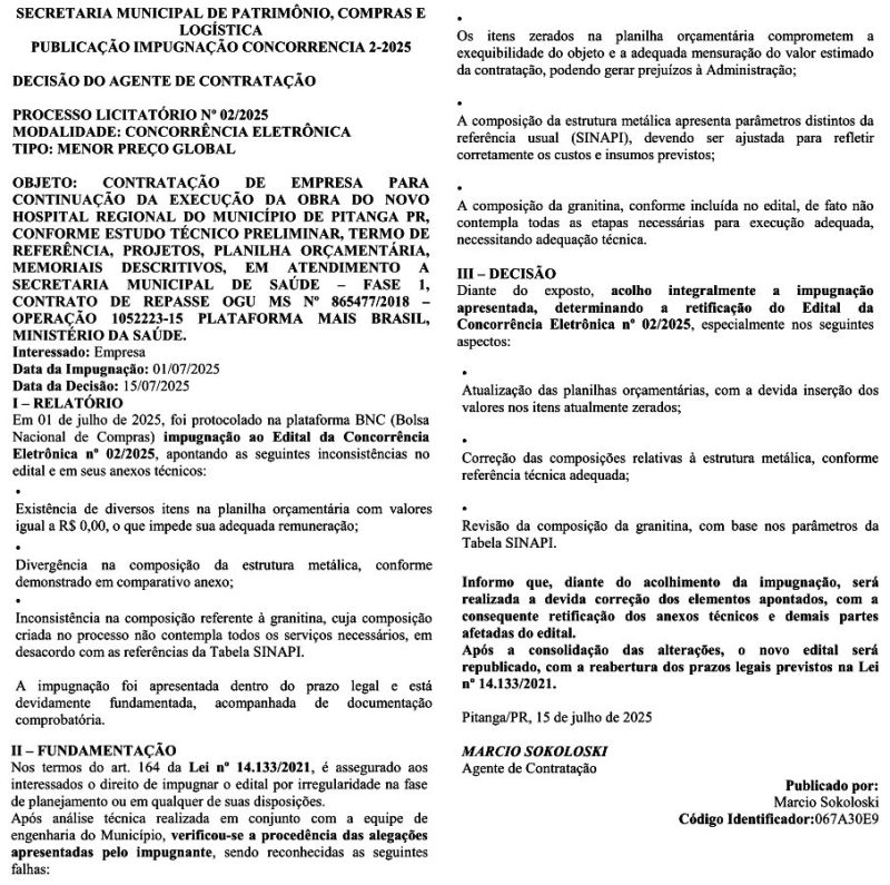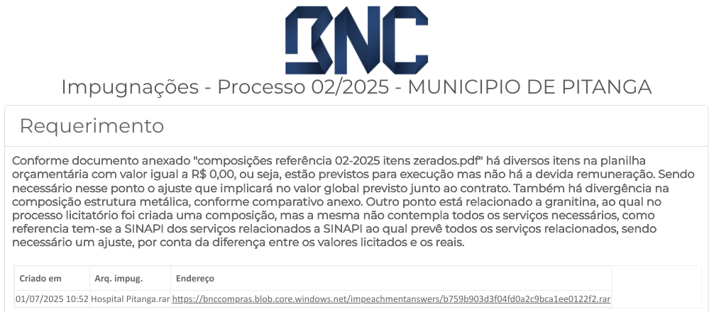 No dia 1º de julho de 2025, foi protocolado na plataforma BNC (Bolsa Nacional de Compras) impugnação ao Edital da Concorrência Eletrônica nº 02/2025, apontando as seguintes inconsistências no edital e em seus anexos técnicos: