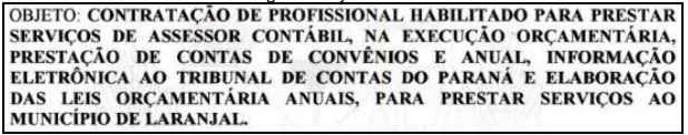 Aponta que participou regularmente do processo licitatório e que todos os serviços contratados foram efetivamente prestados. Ressalta que, mesmo após o encerramento do contrato, continuou prestando auxílio ao Município em suas demandas administrativas. Reconhece que havia contadora nomeada no quadro do Município, mas justifica sua contratação sob o argumento de que atuava em apoio à referida servidora, prestando suporte técnico. Por fim, sustenta que o município de Laranjal observou os termos do Prejulgado n. 6 desta Corte ao prover o cargo de contador mediante concurso público. João Elinton Dutra, prefeito do Município, apresentou contraditório por meio da Petição Intermediária n. 203.636/21 (peças 73 a 84).