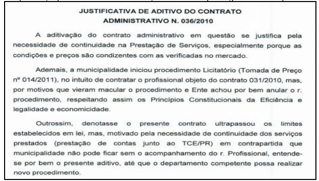 Fonte: peça 63, fl. 21 Essa mesma justificativa ressurge no 8º e 9º termos aditivos, com a afirmação de que estão sendo realizados atos administrativos para nova contratação ao mesmo tempo em que é admitida a irregularidade da situação.