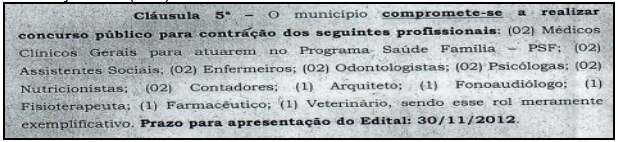 Fonte: peça 63, fl. 21. O TAC celebrado guarda especial relação com a discussão do presente processo na medida em que os serviços terceirizados deveriam ser prestados unicamente por servidor público contratado por concurso público, em vez da forma terceirizada.