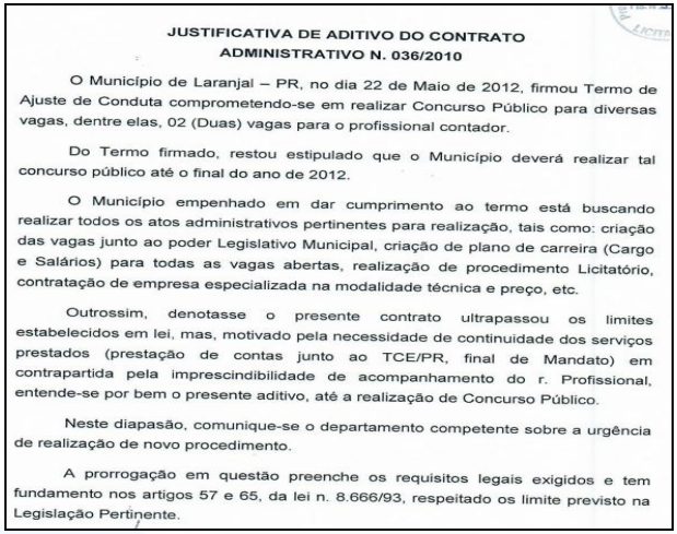 Posteriormente, em 18 de maio de 2016, foi celebrado o 3º Termo Aditivo, prorrogando a vigência contratual até dezembro de 2016, último ano do exercício do segundo mandato do João Elinton Dutra. Desde o ano de 2013, a servidora Adriana Collito já ocupava o cargo de contadora do Município (peça 79), não se justificando, portanto, a contratação dos serviços prestados por Antônio Simiano, uma vez que este não desempenhava nenhuma função específica que não pudesse ser exercida pela servidora efetiva. Em diversos precedentes, o Tribunal já reconheceu a irregularidade dessa prática: