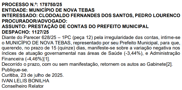 Diante do Parecer 628/25 – 1PC (peça 12) pela irregularidade das contas, intime-se o MUNICÍPIO DE NOVA TEBAS, representado por seu Prefeito Municipal, para que, querendo, no prazo de 15 (quinze) dias, manifeste-se sobre a variação negativa nos índices de atuação governamental nas áreas de Saúde (-3,44%), e Administração Financeira (-4,46%)[1].