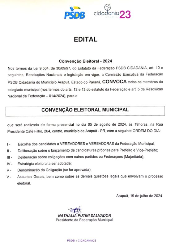A Comissão Executiva da Federação PSDB/Cidadania de Arapuã, município da região central do Estado do Paraná, convoca a todos os membros do colegiado municipal para a Convenção Eleitoral Municipal que será realizada de forma presencial no dia 05 de agosto de 2024, às 19horas, na Rua Presidente Café Filho, 264, Centro do Município de Arapuã – PR, com a seguinte ORDEM DO DIA: