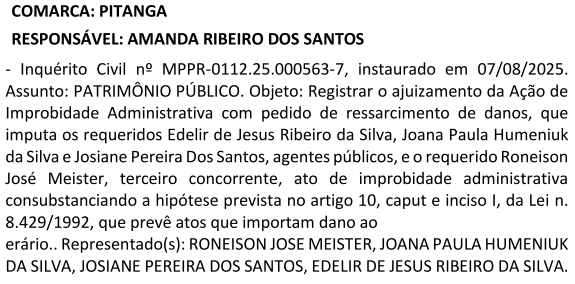 O Ministério Público do Estado do Paraná – MPPR, por meio da 2ª Promotoria de Justiça da Comarca de Pitanga instaurou no dia 7 de agosto, um Inquérito Civil de nº 0112.25.000563-7, para registrar o ajuizamento da Ação de Improbidade Administrativa com pedido de ressarcimento de danos, que imputa os requeridos Edelir de Jesus Ribeiro da Silva, Joana Paula Humeniuk da Silva e Josiane Pereira dos Santos, agentes públicos, e o requerido Roneison José  Meister, terceiro concorrente, ato de improbidade administrativa consubstanciando a hipótese prevista no artigo 10, caput e inciso I, da Lei n. 8.429/1992, que prevê atos que importam dano ao erário.