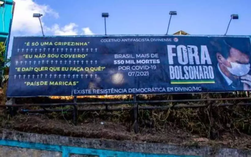 Neste, frases que o presidente disse em entrevistas e lives em conversas sobre a pandemia da COVID-9 ficaram em destaque. O Outdoor ainda citava que em julho de 2021, o número de mortes ultrapassou 550 mil por COVID. (Por Ana Mendonça do Jornal Estado de Minas)