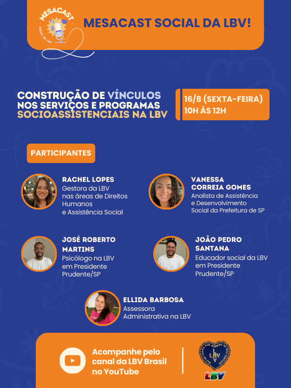 A ser realizado pela Legião da Boa Vontade, no próximo dia 16 de agosto (sexta-feira), das 10 às 12 horas, o MesaCast, evento on-line e gratuito, abordará o tema “Construção de vínculos nos serviços e programas socioassistenciais na LBV”. Este encontro dinâmico proporcionará um espaço para compartilhar ideias e opiniões sobre o assunto. A transmissão será ao vivo pelo YouTube no perfil @LBVBrasil.