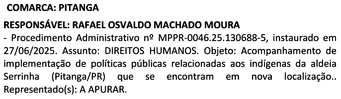 O Ministério Público do Estado do Paraná – MPPR, instaurou no dia 27 de junho de 2025, um Procedimento Administrativo, com o assunto: Direitos Humanos, para o Acompanhamento de Implementações de Políticas Públicas, relacionadas aos Indígenas da Aldeia Serrinha, do interior do Município de Pitanga.