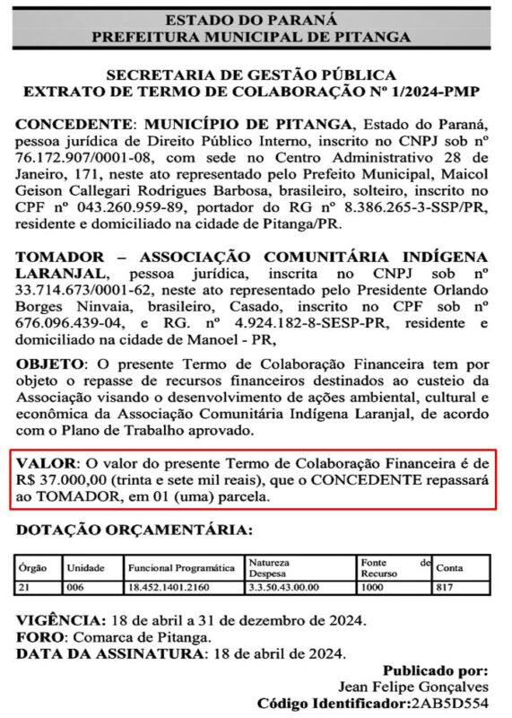 Lembrando que a poucos dias atrás a nossa reportagem noticiou a respeito de um repasse por parte do Município de Pitanga, no valor de R$ 37 mil reais para a Aldeia Indígena Ivaí, através de um Termo de Colaboração com a Associação Comunitária Indígena Laranjal.
