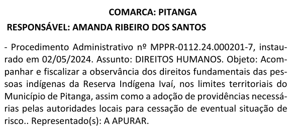 O Ministério Público do Estado do Paraná – MPPR, por meio da 2ª Promotoria de Justiça da Comarca de Pitanga, Promotora Amanda Ribeiro dos Santos, instaurou um Processo Administrativo nº MPPR-0112.24.000201-7, em data de 02/05/2024, com um assunto muito importante que é o de Direitos Humanos, com o objetivo de acompanhar e fiscalizar a observância dos direitos fundamentais das pessoas indígenas da Reserva Indígena Ivaí, nos limites territoriais do Município de Pitanga, assim como a adoção de providências necessárias pelas autoridades locais para cessação de eventual situação de risco.