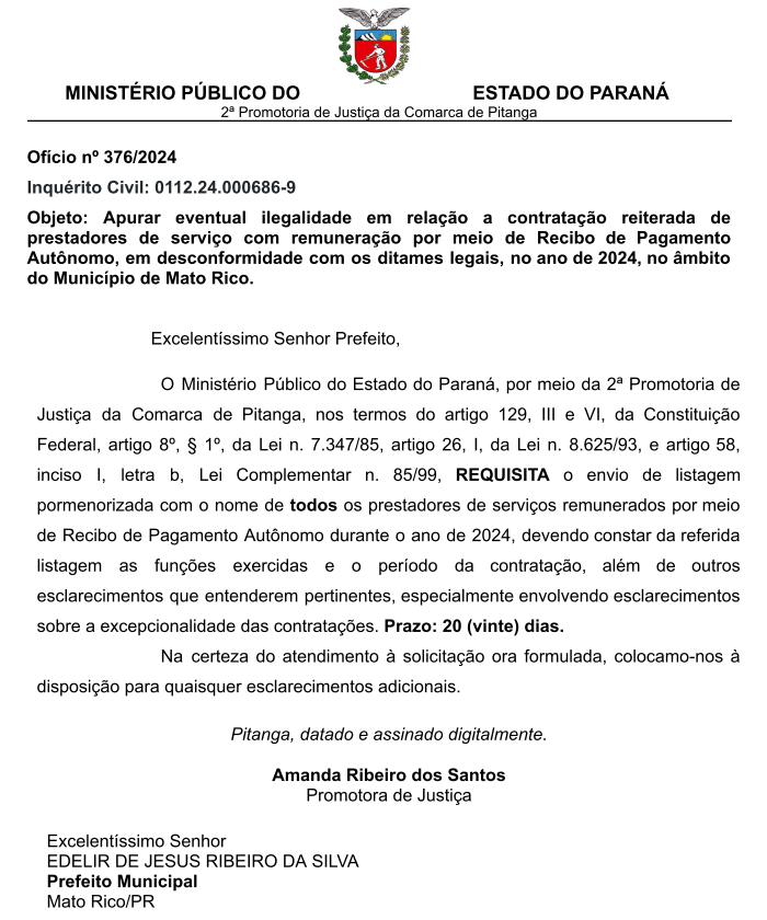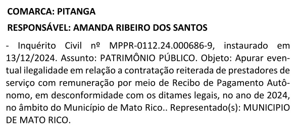 O Ministério Público do Estado do Paraná – MPPR, por meio da Promotoria de Justiça da Comarca de Pitanga, na responsabilidade da Promotora Amanda Ribeiro dos Santos, instaurou no dia 12 de dezembro de 2024, o Inquérito Civil de nº MPPR-0112.24.000686-9, para apurar eventual ilegalidade em relação a contratação reiterada de prestadores de serviço com remuneração por meio de Recibo de Pagamento Autônomo, em desconformidade com os ditames legais, no ano de 2024, na prefeitura municipal de Mato Rico, município da região central do Paraná.