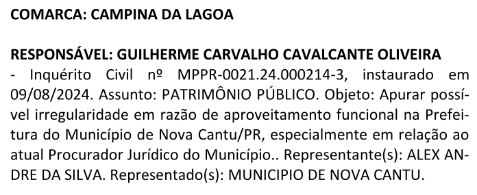 O Ministério Público do Estado do Paraná – MPPR, por meio da Promotoria de Justiça da Comarca de Campina da Lagoa, Promotor de Justiça Dr. Guilherme Carvalho Cavalcante Oliveira, instaurou o Inquérito Civil de nº MPPR-0021.24.000214-3, no dia 09 de agosto de 2024, com assunto Patrimônio Público, para apurar possível irregularidade em razão de aproveitamento funcional na Prefeitura do Município de Nova Cantu/PR, especialmente em relação ao atual Procurador Jurídico do Município, e que tem como representante, a pessoa de Alex André da Silva, e como representado, o Município de Nova Cantu/PR.