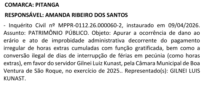 O Ministério Público do Estado do Paraná – MPPR, por meio da 2ª Promotoria de Justiça da Comarca de Pitanga, Promotora Dr.ª Amanda Ribeiro dos Santos, instaurou em 09 de abril de 2026, um Inquérito Civil de nº 0112.26.000060-2, com assunto: Patrimônio Público, para apurar suposta ocorrência de Dano ao Erário Público e Ato de Improbidade Administrativa, decorrente do suposto pagamento irregular de horas extras cumuladas com função gratificada, bem como a suposta conversão ilegal de dias de interrupção de férias em pecúnia (como horas extras), em favor do servidor Gilnei Luiz Kunast, pela Câmara Municipal de Boa Ventura de São Roque, no exercício de 2025.