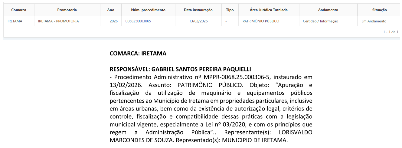 O Ministério Público do Estado do Paraná – MPPR, por meio da Promotoria de Justiça da Comarca de Iretama/PR, Promotor Dr. Gabriel Santos Pereira Paquielli, instaurou em 13 de fevereiro de 2026, um Procedimento Administrativo (PA), nº 0068.25.000306-5, para “Apuração e Fiscalização da utilização de maquinário e equipamentos públicos pertencentes ao Município de Iretama, em propriedades particulares, inclusive em áreas urbanas, bem como da existência de autorização legal, critérios de controle, fiscalização e compatibilidade dessas práticas com a legislação municipal vigente, especialmente a Lei nº 03/2020, e com os princípios que regem a Administração Pública”, tendo como representante: Lorisvaldo Marcondes de Souza, e como representado: o Município de Iretama/PR.