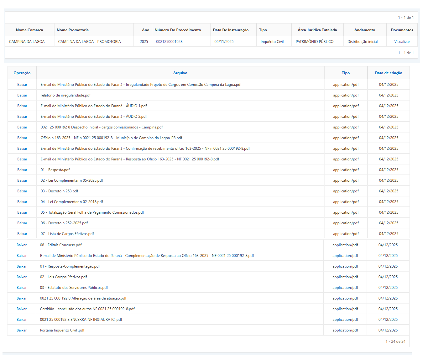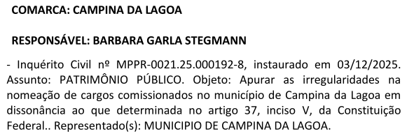 O Ministério Público do Estado do Paraná – MPPR, por meio da Promotoria de Justiça da Comarca de Campina da Lagoa, Promotora Dr.ª Barbara Garla Stegmann, instaurou em 03 de dezembro de 2025, um Inquérito Civil de nº 0021.25.000192-8, com assunto: Patrimônio Público, para apurar supostas irregularidades na nomeação de cargos comissionados na prefeitura desse Município de Campina da Lagoa/PR, em dissonância ao que determinada o artigo 37, inciso V, da Constituição Federal.