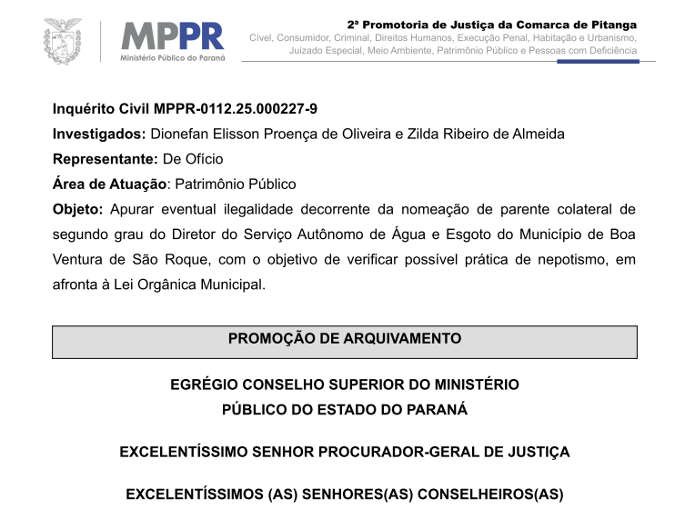 Após apuração e oitiva dos envolvidos, o Ministério Público do Estado do Paraná – MPPR, 2ª Promotoria de Justiça da Comarca de Pitanga, Promotora Amanda Ribeiro dos Santos, arquivou o Inquérito Civil instaurado em 11 de abril de 2025, para Apurar eventual ilegalidade decorrente da nomeação de parente colateral de segundo grau do Diretor do Serviço Autônomo de Água e Esgoto do Município de Boa Ventura de São Roque, com o objetivo de verificar possível prática de nepotismo, em afronta à Lei Orgânica Municipal, tendo como representados: Dionefan Elisson Proenca de Oliveira e Zilda Ribeiro de Almeida.