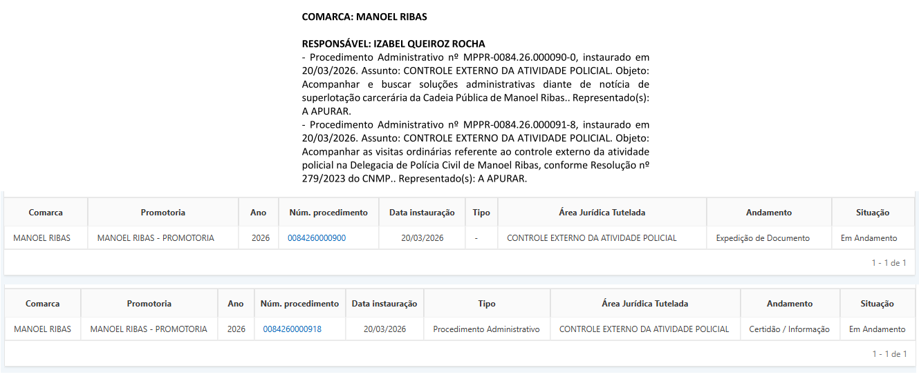 O Ministério Público do Estado do Paraná – MPPR, por meio da Promotoria de Justiça da Comarca de Manoel Ribas, Promotora Dr.ª Izabel Queiroz Rocha, instaurou em 20 de março de 2026, Procedimentos Administrativos – PAs, para acompanhar e buscar soluções administrativas quanto a superlotação carcerária da Cadeia Pública e, para acompanhar as visitas ordinárias referente ao controle externo da atividade policial na Delegacia de Polícia Civil de Manoel Ribas.