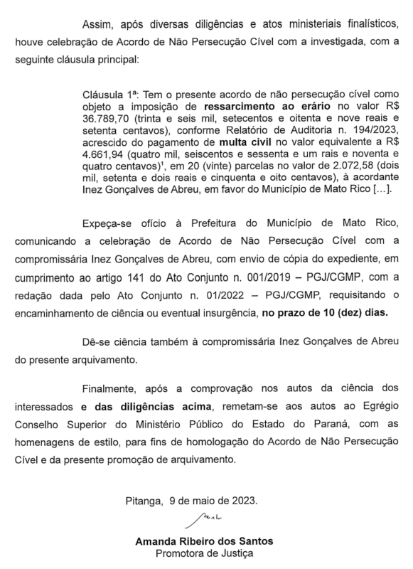 O Ministério Público do Estado do Paraná – MPPR, por meio da 2ª Promotoria de Justiça da Comarca de Pitanga, Promotora Amanda Ribeiro dos Santos, firmou um Acordo de Não Persecução Civil com a Senhora Inez Gonçalves de Abreu, Vice-prefeita de Mato Rico, município da região central do Estado do Paraná, após a instauração do Inquérito Civil de nº MPPR-0112.22.000259-9 que apurou sobre recebimentos indevidos por parte da investigada.