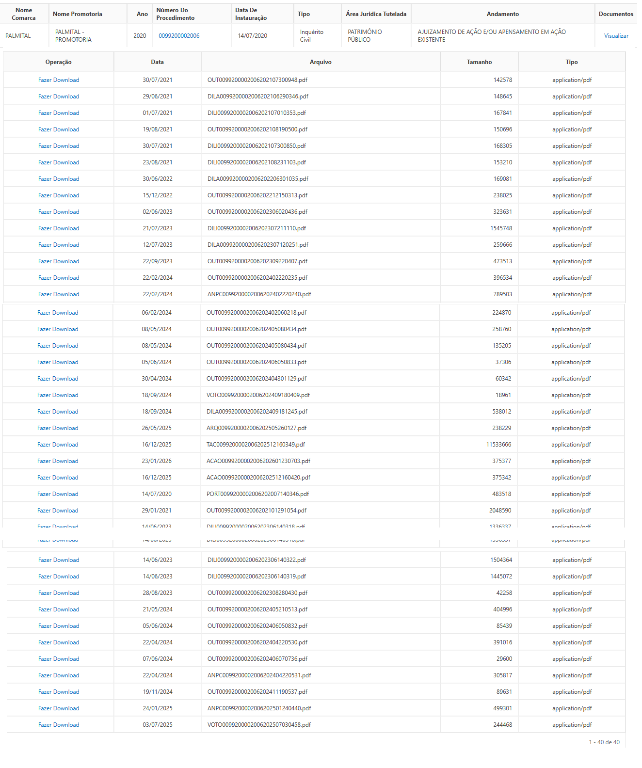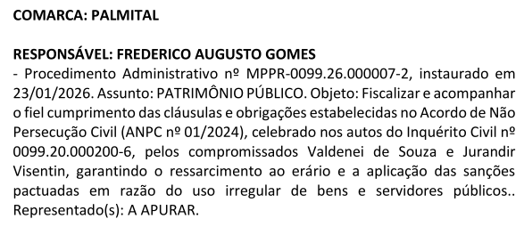 O Ministério Público do Estado do Paraná – MPPR, por meio da Promotoria de Justiça da Comarca de Palmital/PR, Promotor Dr. Frederico Augusto Gomes, instaurou em 23 de janeiro de 2026, um Procedimento Administrativo, com assunto: Patrimônio Público, para fiscalizar e acompanhar o fiel cumprimento das cláusulas e obrigações estabelecidas no Acordo de Não Persecução Civil (ANPC nº 01/2024), celebrado nos autos do Inquérito Civil de nº 0099.20.000200-6, pelos compromissados: Valdenei de Souza, ex-prefeito, e o ex-secretário rodoviário Jurandir Visentin, garantindo o ressarcimento ao erário e a aplicação das sanções pactuadas em razão do uso irregular de bens e servidores públicos.