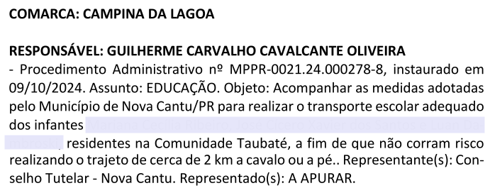 O Ministério Público do Estado do Paraná – MPPR por meio da Promotoria de Justiça da Comarca de Campina da Lagoa, Promotor responsável Dr. Guilherme Carvalho Cavalcante Oliveira, instaurou um Procedimento Administrativo para acompanhar as medidas adotadas pelo Município de Nova Cantu/PR, para realizar o transporte escolar adequado para três alunos, uma menina e dois meninos, residentes na região da Localidade Taubaté, a fim de que não corram risco, realizando o trajeto de cerca de 2 km a cavalo ou a pé para irem a escola.