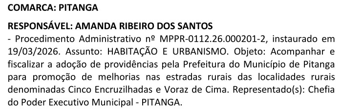 O Ministério Público do Estado do Paraná – MPPR, por meio da 2ª Promotoria de Justiça da Comarca de Pitanga, Promotora Dr.ª Amanda Ribeiro dos Santos, instaurou em 19 de março de 2026, um Procedimento Administrativo – PA, com assunto: Habitação e Urbanismo, para acompanhar e fiscalizar a adoção de providências por parte da Prefeitura Municipal de Pitanga, na promoção de melhorias nas estradas rurais das Localidades de Cinco Encruzilhadas e Vorás de Cima.