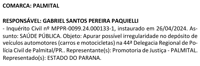 Após vencer o prazo de 30 dias, dado pelo Ministério Público do Estado do Paraná – MPPR, por meio de uma Ação Civil Pública, para que o Estado do Paraná, adotasse providências quanto aos veículos apreendidos na 44ª Delegacia Regional de Polícia da cidade de Palmital/PR, que se encontram a céu aberto no pátio da instituição e arredores, foi instaurado por este órgão ministerial em 26/04/2024, um Inquérito Civil de nº MPPR-0099.24.000133-1, para apurar possível irregularidade no depósito de veículos automotores (carros e motocicletas) na 44ª Delegacia Regional de Polícia Civil de Palmital/PR, tendo como representante, a Promotoria de Justiça desse município da região central do Estado do Paraná, e como representado, o Estado do Paraná.