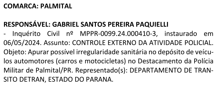 O Ministério Público do Estado do Paraná – MPPR, por meio da Promotoria de Justiça da Comarca de Palmital/PR, Promotor responsável, Gabriel Santos Pereira Paquielli, instaurou o Inquérito Civil nº MPPR-0099.24.000410-3, instaurado em 06/05/2024, com o objetivo de apurar possível irregularidade no depósito de veículos automotores, (carros e motocicletas), no pátio do Destacamento da Polícia Militar – DPM de Palmital/PR, e tem como representado, Departamento de Transito – Detran do Estado do Paraná.