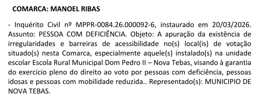 O Ministério Público do Estado do Paraná – MPPR, por meio da Promotoria de Justiça da Comarca de Manoel Ribas, Promotora Dr.ª Izabel Queiroz Rocha, instaurou em 20 de março de 2026, um Inquérito Civil de nº MPPR-0084.26.000092-6, para apurar a “existência de irregularidades e barreiras de acessibilidade no(s) local(is) de votação situado(s) nesta Comarca, especialmente aquele(s) instalado(s) na Unidade Escolar – Escola Rural Municipal Dom Pedro II que fica no Distrito de Catuporanga, no Município de Nova Tebas/PR, visando à garantia do exercício pleno do direito ao voto por pessoas com deficiência, pessoas idosas e pessoas com mobilidade reduzida.
