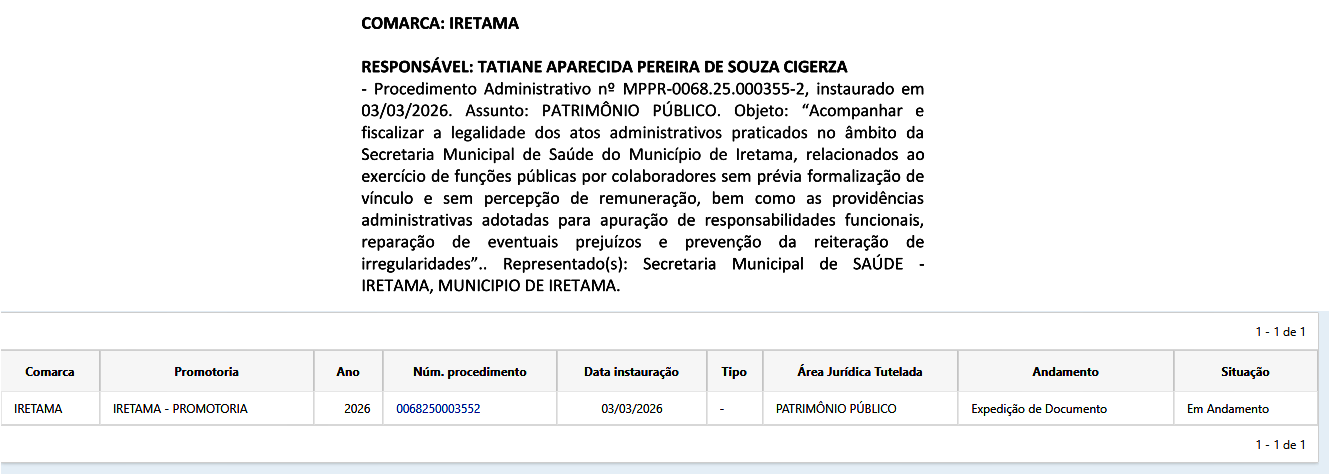 O Ministério Público do Estado do Paraná – MPPR, por meio da Promotoria de Justiça da Comarca de Iretama/PR, Promotora Dr.ª Tatiane Aparecida Pereira de Souza Cigerza, instaurou em 03 de março de 2026, um Procedimento Administrativo – PA, nº 0068.25.000355-2, com assunto: Patrimônio Público, para “acompanhar e fiscalizar a legalidade dos atos administrativos praticados na Secretaria Municipal de Saúde, relacionados ao exercício de funções públicas por colaboradores sem prévia formalização de vínculo e sem percepção de remuneração, bem como as providências administrativas adotadas para apuração de responsabilidades funcionais, reparação de eventuais prejuízos e prevenção da reiteração de irregularidades”.