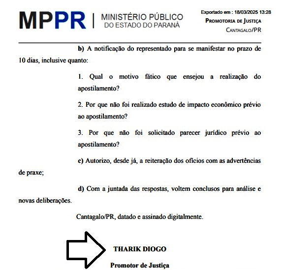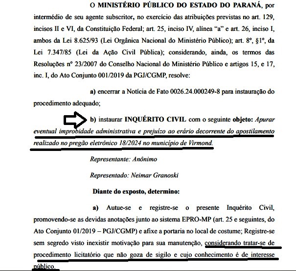 O Ministério Público do Estado do Paraná – MPPR, por meio da Promotoria de Justiça da Comarca de Cantagalo/PR, Promotor de Justiça Tharik Diogo, instaurou a partir de uma Notícia de Fato, um Inquérito Civil (0026.24.000249-8), para apurar eventual Improbidade Administrativa e prejuízo ao erário decorrente do apostilamento – realização do Pregão Eletrônico 18/2024, no Município de Virmond, tendo como representado o ex-prefeito Neimar Granoski.