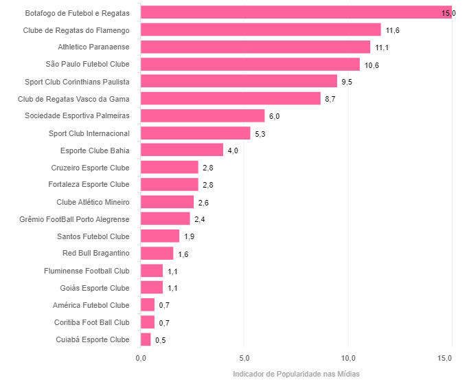 Após a vitória contra o Palmeiras na 12ª rodada do Brasileirão e da permanência na liderança no campeonato, o Botafogo vem mantendo sua torcida ativa nas mídias digitais e é o time mais lembrado tanto nas redes sociais como na imprensa. É o que mostra o Índice Cortex de Popularidade Digital dos Clubes de Futebol, levantamento realizado nos últimos 15 dias pela Cortex, referência em inteligência de vendas B2B na América Latina. Com a mesma metodologia utilizada para análise de marcas e empresas, a startup analisou os 20 clubes que disputam a Série A nesta temporada.