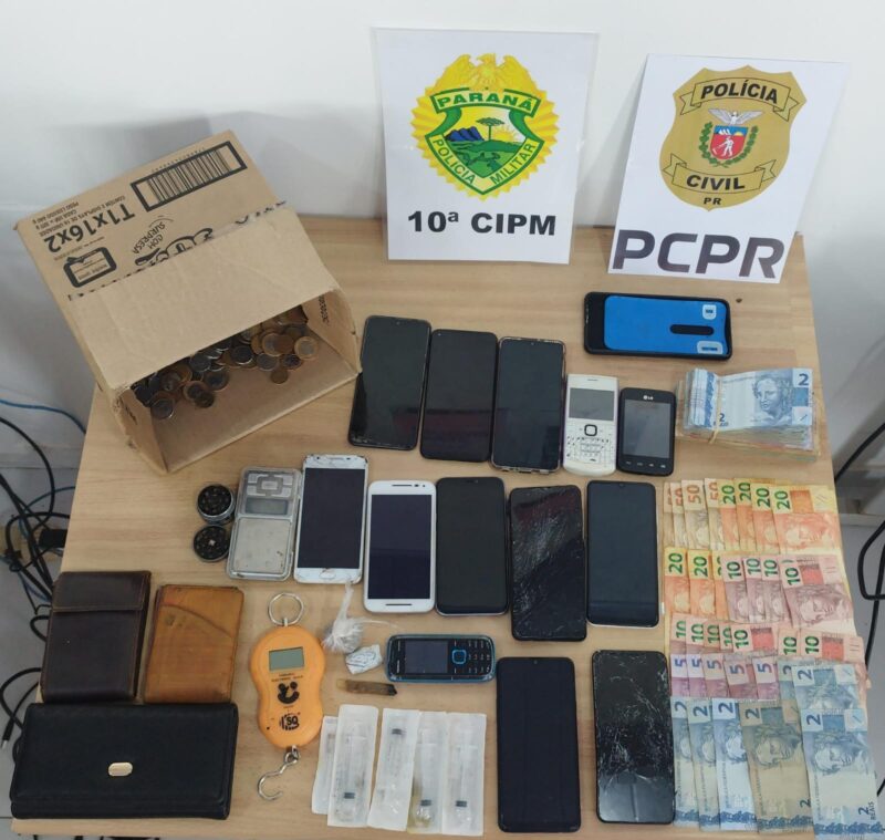 A ação aconteceu durante a Operação Plena Pugna, resultando na prisão de (6) seis pessoas e apreensão de um adolescente, bem como a apreensão de (2) duas armas de fogo, diversas munições, certa quantia de entorpecentes (maconha e cocaína), balanças de precisão, vários celulares que serão submetidos à análise pericial, quase R$ 10 mil reais em espécie, entre outros objetos apreendidos em poder dos conduzidos.