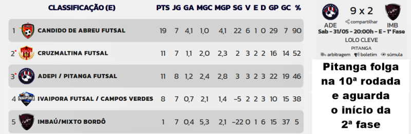 Pitanga Futsal folga na última rodada dessa 1ª fase e aguarda o sorteio da próxima fase para saber qual será o seu próximo compromisso já valendo pela 2ª fase da competição.