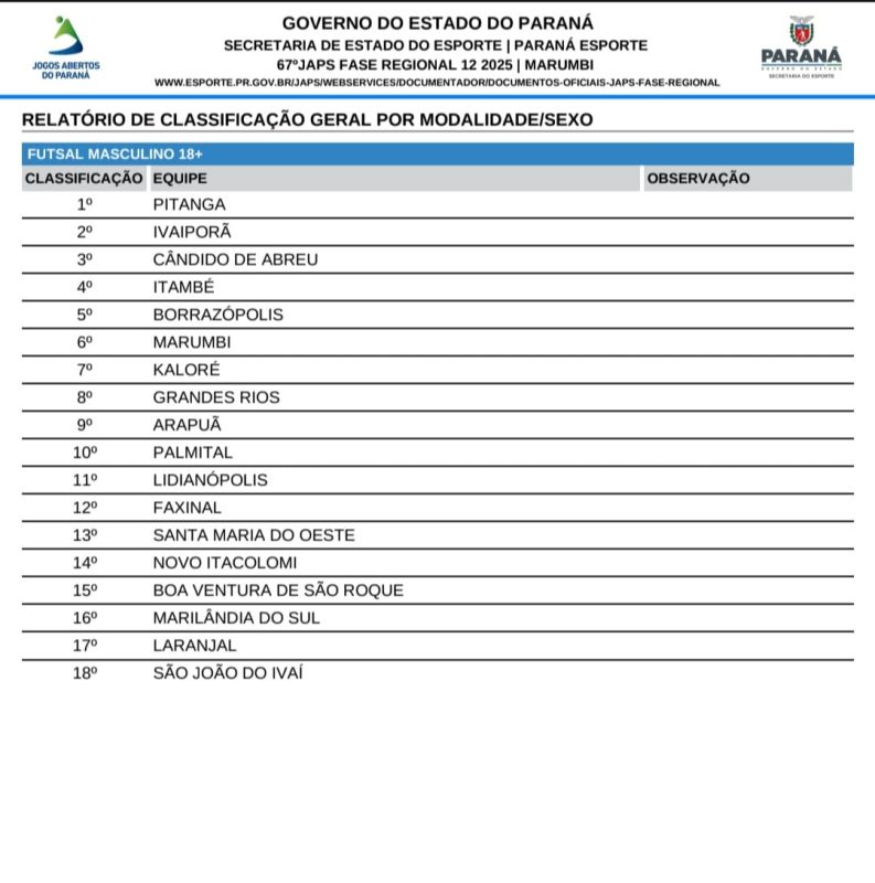 A equipe do Pitanga Futsal se sagrou campeã dos Jogos Abertos do Paraná – JAPs, 2025, realizado no Município de Marumbi/PR, ao vencer a equipe do Ivaiporã Futsal neste domingo (06) pelo placar de 2 x 1.