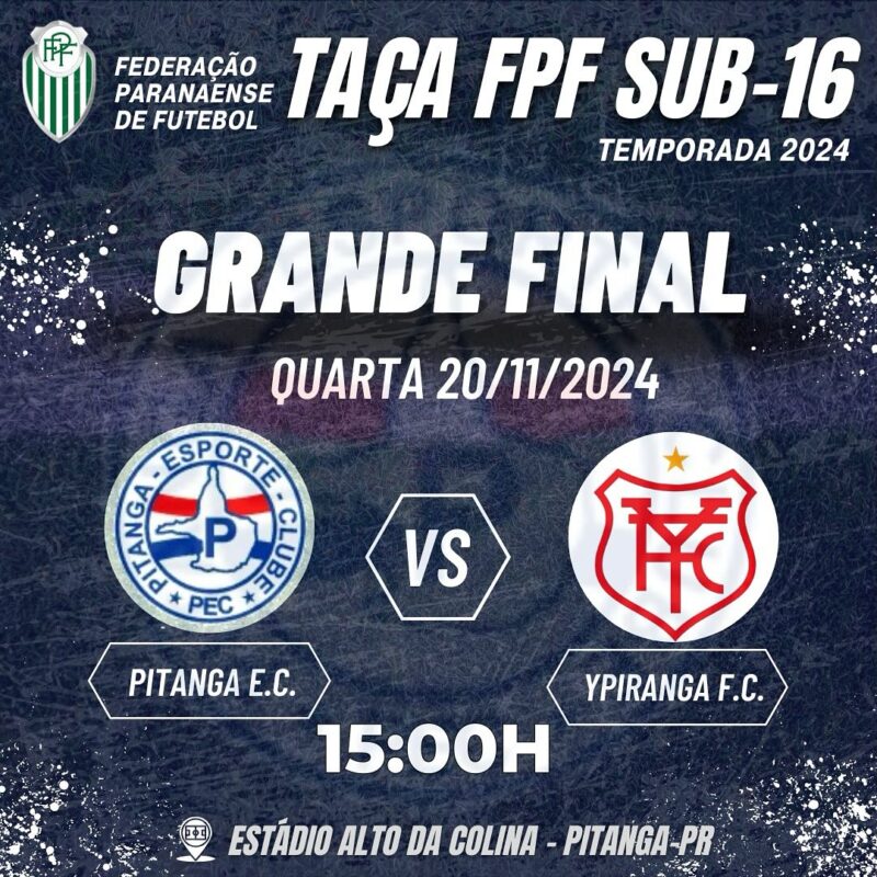 Nesta quarta-feira, dia 20 de novembro de 2024, Feriado Nacional, Dia da Consciência Negra, acontece em Pitanga, a decisão da Taça FPF Sub 16, onde a equipe de Pitanga recebe a equipe do Ypiranga, da cidade de Palmeira, no jogo de volta da final da competição promovida pela Federação Paranaense de Futebol.