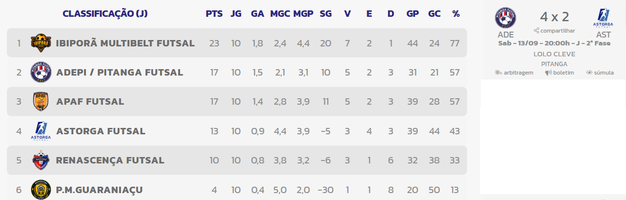 O Pitanga Futsal venceu a equipe do Astorga Futsal pelo placar de 4 x 2, e consegue a 2ª colocação no grupo com 17 pontos ganhos.
