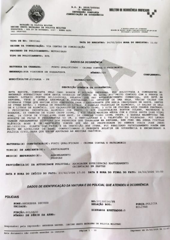 Na manhã desta terça-feira, dia 24 de fevereiro de 2026, a equipe policial foi acionada por um rapaz, locatário de um imóvel no Centro da cidade de Pitanga, onde segundo ele, estaria reformando para em breve inaugurar um Restaurante e Churrascaria, relatou que o referido imóvel teve uma janela arrombada, por onde ladrão ou ladrões entraram e furtaram do interior de uma sala, várias caixas com diversos itens que haviam sido comprados para montar o referido comércio.