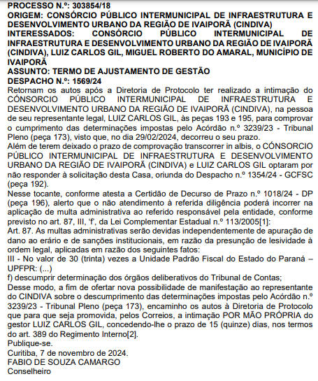PROCESSO N.º 303854/18. ORIGEM: CONSÓRCIO PÚBLICO INTERMUNICIPAL DE INFRAESTRUTURA E DESENVOLVIMENTO URBANO DA REGIÃO DE IVAIPORÃ (CINDIVA). INTERESSADOS: CONSÓRCIO PÚBLICO INTERMUNICIPAL DE INFRAESTRUTURA E DESENVOLVIMENTO URBANO DA REGIÃO DE IVAIPORÃ (CINDIVA), LUIZ CARLOS GIL, MIGUEL ROBERTO DO AMARAL, MUNICÍPIO DE IVAIPORÃ. ASSUNTO: TERMO DE AJUSTAMENTO DE GESTÃO. DESPACHO N.º: 1569/24.