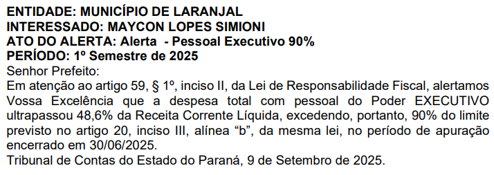 O Tribunal de Contas do Estado do Paraná – TCE-PR, emitiu mais um alerta ao Prefeito de Laranjal, município da região central do estado, quanto aos gastos com o pessoal do Poder Executivo, que segundo o documento publicado em Diário Eletrônico e que a nossa reportagem teve acesso, a despesa total com pessoal do Poder Executivo, ultrapassou 48,6% da Receita Corrente Líquida, excedendo, portanto, 90% do limite previsto, no período de apuração encerrado em 30/06/2025.