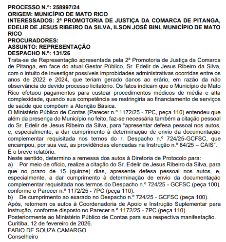 PROCESSO N.º: 258997/24 ORIGEM: MUNICÍPIO DE MATO RICO INTERESSADOS: 2ª PROMOTORIA DE JUSTIÇA DA COMARCA DE PITANGA, EDELIR DE JESUS RIBEIRO DA SILVA, ILSON JOSÉ BINI, MUNICÍPIO DE MATO RICO PROCURADORES: ASSUNTO: REPRESENTAÇÃO DESPACHO N.º: 131/26.