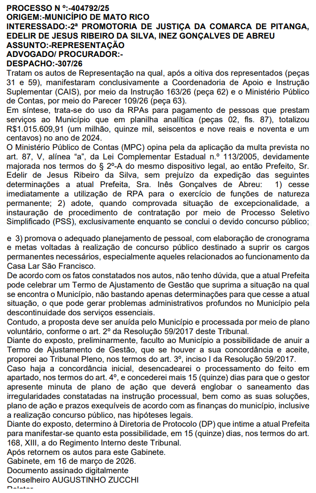PROCESSO N º:-404792/25 ORIGEM:-MUNICÍPIO DE MATO RICO INTERESSADO:-2ª PROMOTORIA DE JUSTIÇA DA COMARCA DE PITANGA, EDELIR DE JESUS RIBEIRO DA SILVA, INEZ GONÇALVES DE ABREU ASSUNTO:-REPRESENTAÇÃO ADVOGADO/ PROCURADOR:- DESPACHO:-307/26.