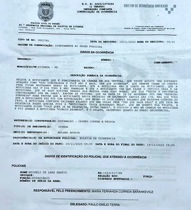 Segundo o relatório da Polícia Militar do Município de Boa Ventura de São Roque/PR, o fato aconteceu na manhã de terça-feira, dia 18 de novembro de 2025, e por volta das 10h30min, uma servidora concursada de 45 anos, compareceu no Destacamento, relatando que nesta data, durante uma reunião de trabalho na Câmara de Vereadores desse município da região central do estado, foi agredida fisicamente por outra servidora comissionada.