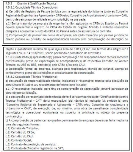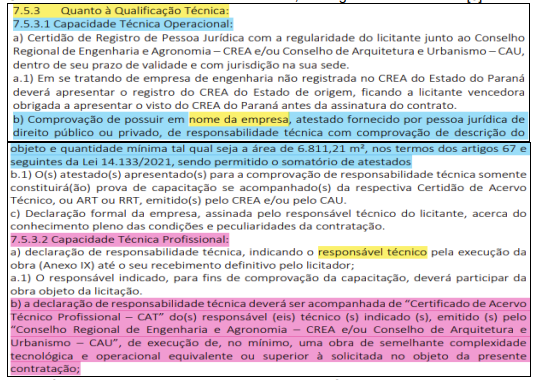 Pois bem. A questão em análise refere-se ao item 7.5.3.1, “b”, do edital da Concorrência n.º 005/2024 do Município de Altamira do Paraná, que assim dispõe para fins de qualificação técnica: b) Comprovação de possuir em nome da empresa, atestado fornecido por pessoa jurídica de direito público ou privado, de responsabilidade técnica com comprovação de descrição do objeto e quantidade mínima tal qual seja a área de 6.811,21 m², nos termos dos artigos 67 e seguintes da Lei 14.133/2021, sendo permitido o somatório de atestados. b.1) O(s) atestado(s) apresentado(s) para a comprovação de responsabilidade técnica somente constituirá(ão) prova de capacitação se acompanhado(s) da respectiva Certidão de Acervo Técnico, ou ART ou RRT, emitido(s) pelo CREA e/ou pelo CAU.