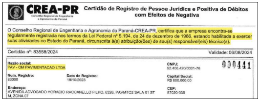 Nessa senda, outro aspecto importante para a análise de conduta da PAV – OM Pavimentação Ltda é a ordem em que os documentos foram anexados. Logo após apresentar o documento supramencionado, a empresa colaciona a seguinte certidão[6]: