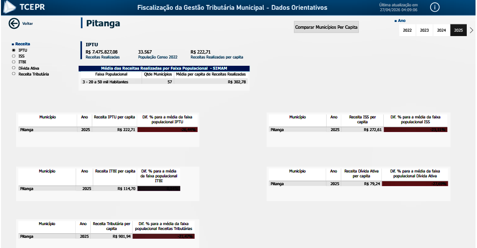 Adicionalmente, o Relatório de Demanda, publicado no Portal Informação para Todos (PIT) – acessível por meio do site do TCE-PR – consolida os resultados do trabalho. Indicadores tributários e informações orientativas sobre a atuação fiscalizatória do Tribunal na área da receita pública também estão disponíveis no PIT, no painel Gestão Tributária Municipal.