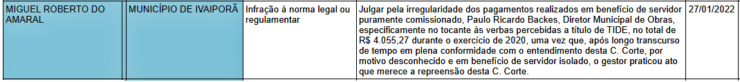 Julgar pela parcial procedência da Tomada de Contas em apreço, nos seguintes termos: […] (b) no que tange à gestão de Miguel Roberto de Amaral, julgar pela irregularidade dos pagamentos realizados em benefício de servidor puramente comissionado, Paulo Ricardo Backes, Diretor Municipal de Obras, especificamente no tocante às verbas percebidas a título de TIDE, no total de R$ 4.055,27 (quatro mil, cinquenta e cinco reais e vinte e sete centavos) durante o exercício de 2020, uma vez que, após longo transcurso de tempo em plena conformidade com o entendimento desta C. Corte, por motivo desconhecido e em benefício de servidor isolado, o gestor praticou ato que merece a repreensão desta C. Corte;