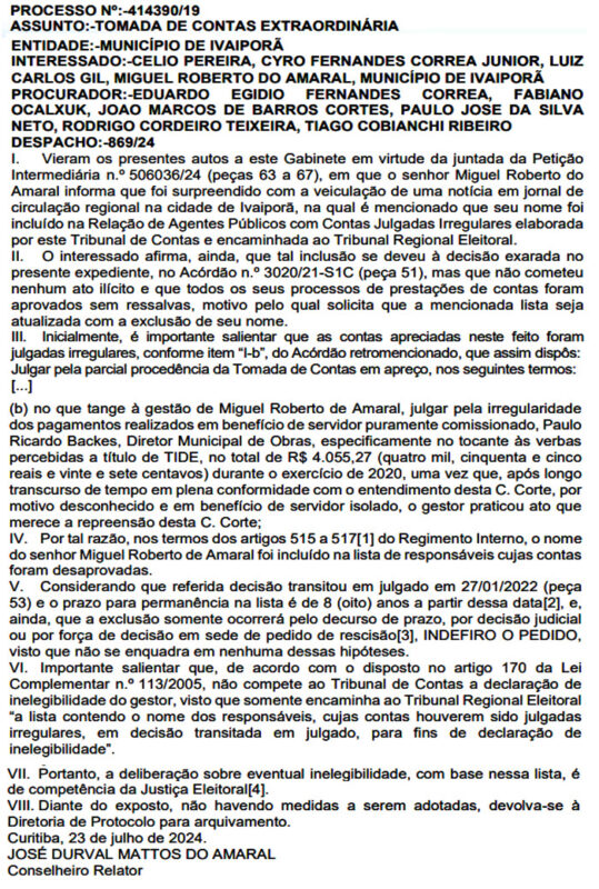 I. Vieram os presentes autos a este Gabinete em virtude da juntada da Petição Intermediária n.º 506036/24 (peças 63 a 67), em que o senhor Miguel Roberto do Amaral informa que foi surpreendido com a veiculação de uma notícia em jornal de circulação regional na cidade de Ivaiporã, na qual é mencionado que seu nome foi incluído na Relação de Agentes Públicos com Contas Julgadas Irregulares elaborada por este Tribunal de Contas e encaminhada ao Tribunal Regional Eleitoral.