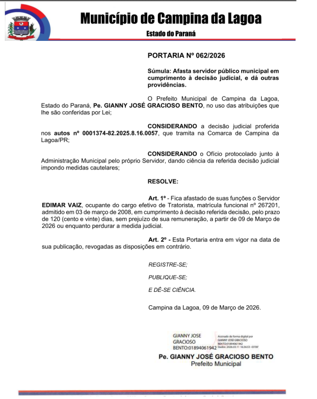 Edimar Vaiz é servidor efetivo no cargo de tratorista desde 03 de março de 2008. O afastamento ocorre em cumprimento à decisão judicial que impôs medidas cautelares no processo nº 0001374-82.2025.8.16.0057, em tramitação na Comarca de Campina da Lagoa.